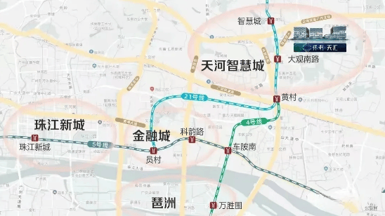 交通方面,项目距离地铁 21 号线大观南路站约 1.2 公里,步行 15 分钟可达,也可通过电动车接驳,一站换乘 4 号线直达金融城、琶洲,4 站到员村换乘 5 号线进入珠江新城,全程控制在 1 小时内。自驾出行则依托广深高速、广园快线、大观路及在建的机场第二高速,40 分钟内可抵达越秀、海珠等城区中心,出行便捷度较高。