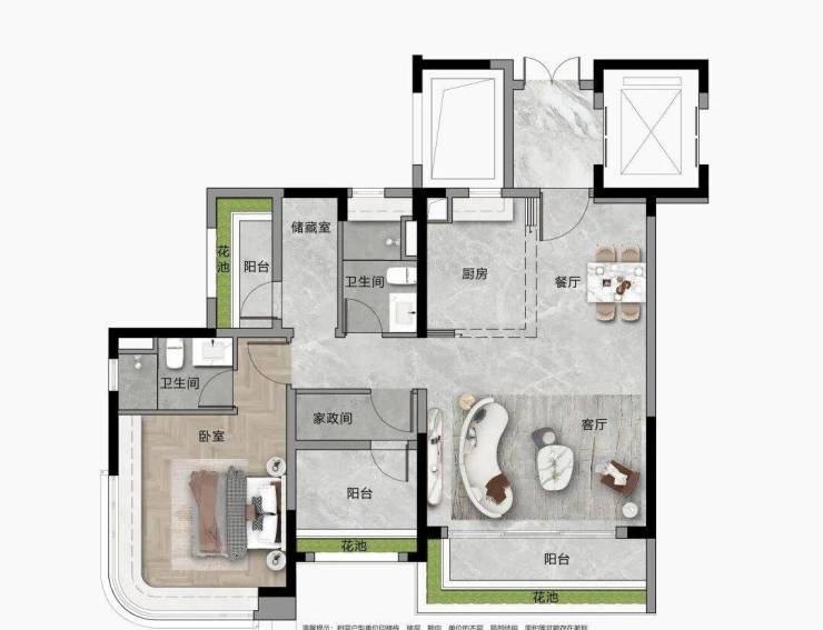 这款户型被市场誉为“爆款小户”,是片区内极为罕见的低门槛中心区入场券。虽然面积紧凑,但空间感却丝毫不输大户型。入户花园的设计,不仅增加了收纳空间,更营造出一种归家的仪式感。最大约4.9米的开间大方厅,让客厅显得宽敞明亮,足以容纳一家人的欢声笑语。主卧同样配备了270°转角飘窗,全屋采光面约达12米,阳光洒满每一个角落。超高使用率让这个小户型拥有了超越同级的空间体验,无论是年轻夫妇的首套房,还是投资者的优选,都是不可多得的佳品。