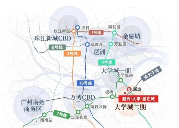 对于上班族来说,通勤便捷度是买房的核心考量之一,而越秀·大学·星汇城在这方面堪称“六边形战士”。项目紧邻地铁4号线新造站,小区东门开放后可直连广医南路,步行距离缩短至800米左右,日常步行15分钟内即可抵达地铁站,完全在舒适步行范围内。4号线作为广州南部的交通大动脉,串联起多个核心就业区,1站直达大学城,3站抵达万博CBD,4站直达琶洲会展中心,5站可达金融城,无论是在这些区域上班,还是日常出行办事,都十分便捷。