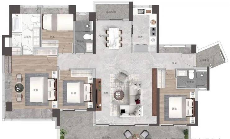 182㎡四房两厅三卫:层高3.3米,净开间阔绰宽厅连通景观阳台,使用率接近100%。