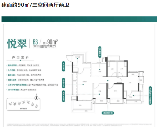 约90㎡三房两卫(“悦翠”户型):功能齐全,动静分区合理;