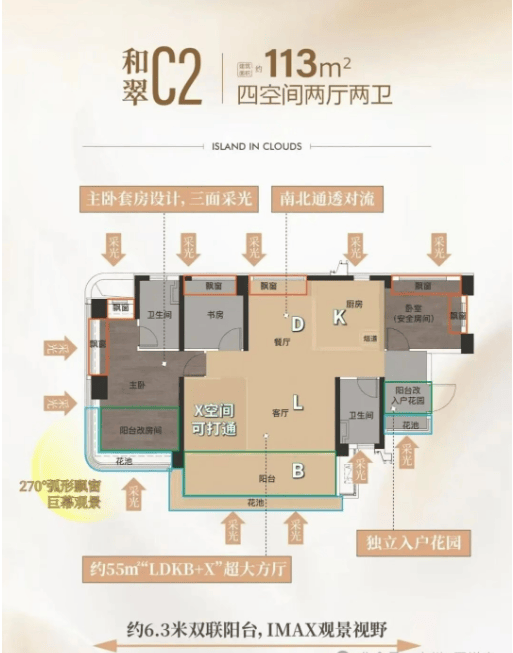 约113㎡四房两卫(“和翠”户型):LDK一体化公区,空间开阔,适合多孩家庭。