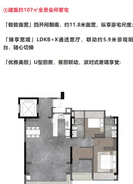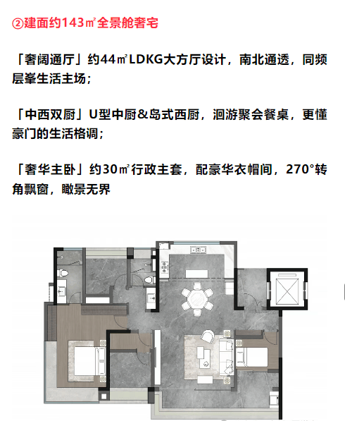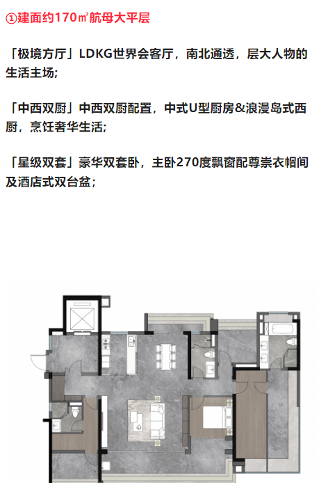 项目作为新规户型代表,实测使用率高达 115%,所有户型均为纯板式设计,实现 100% 南北对流与 100% 四开间朝南。107㎡户型四开间朝南,面宽达 11.8 米,联动 5.9 米景观阳台,空间开阔度远超同面积段产品;143㎡户型打造约 44㎡LDKG 大方厅,配备中西双厨,主卧面积超 30㎡,270° 转角飘窗带来无界瞰景体验;170㎡航母大平层更是以 “极境方厅” 设计,中西双厨与星级双套卧配置,满足高端改善需求。