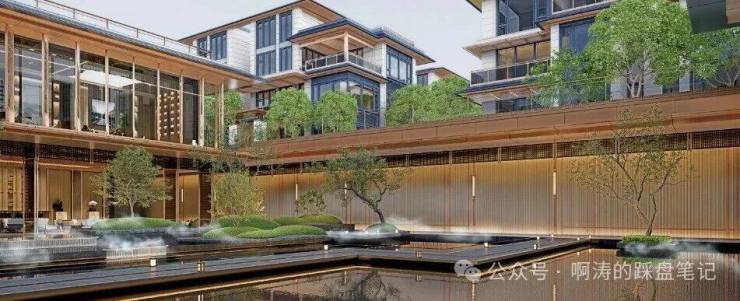 当你踏进小区入口,首先映入眼帘的是下庭沉院。设计风格借鉴了宋代园林的简约美感,一步一景,移步换形。石灯笼静静立在池边,倒映着天空的云影,偶尔有几尾锦鲤游过,划破水面如丝缎般的平静。