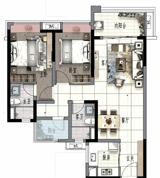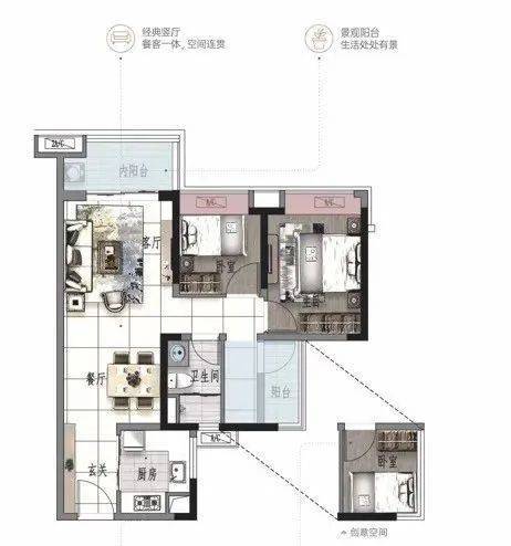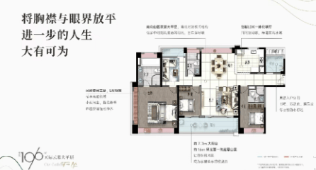 99㎡三房两卫:南向约6米阳台,尽揽自然景观,灵动入户空间。