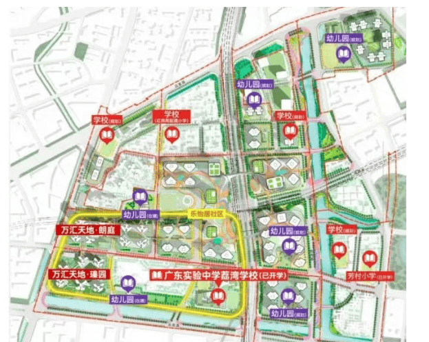项目配建一所54班九年制学校——广东省实验中学花地湾校区(含36班小学+18班初中),已于2023年9月正式开学,业主子女可优先申请入读(最终以教育局当年招生政策为准)。值得注意的是,该校为“九年制”而非“九年一贯制”,即小学毕业后仍需参与荔湾区公办初中电脑派位,无法直接直升本校初中部。整个万汇天地片区共规划7所幼儿园、3所小学、3所中学,教育资源整体充裕,但家长需提前了解区域升学政策,合理规划子女教育路径。
