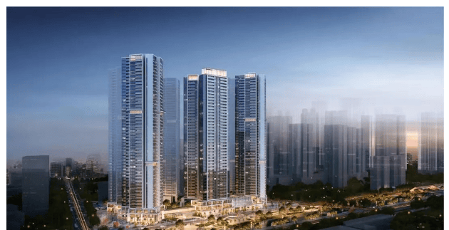 瑧园总占地面积约2.7万平方米,总建筑面积近19.9万平方米,规划7栋42-48层超高层住宅,搭配约4000平方米社区商业。项目共提供约1427户住宅单位,车位配比高达1:1.37,远超市场平均水平。所有楼栋采用围合式+风车型布局,最大化南向采光面,东南朝向占比达三分之二,确保绝大多数户型拥有滨水景观视野。建筑高度与密度经过精密测算,在保证私密性的同时,营造出开阔的中央园林空间,真正实现“高密度中的低密感”。