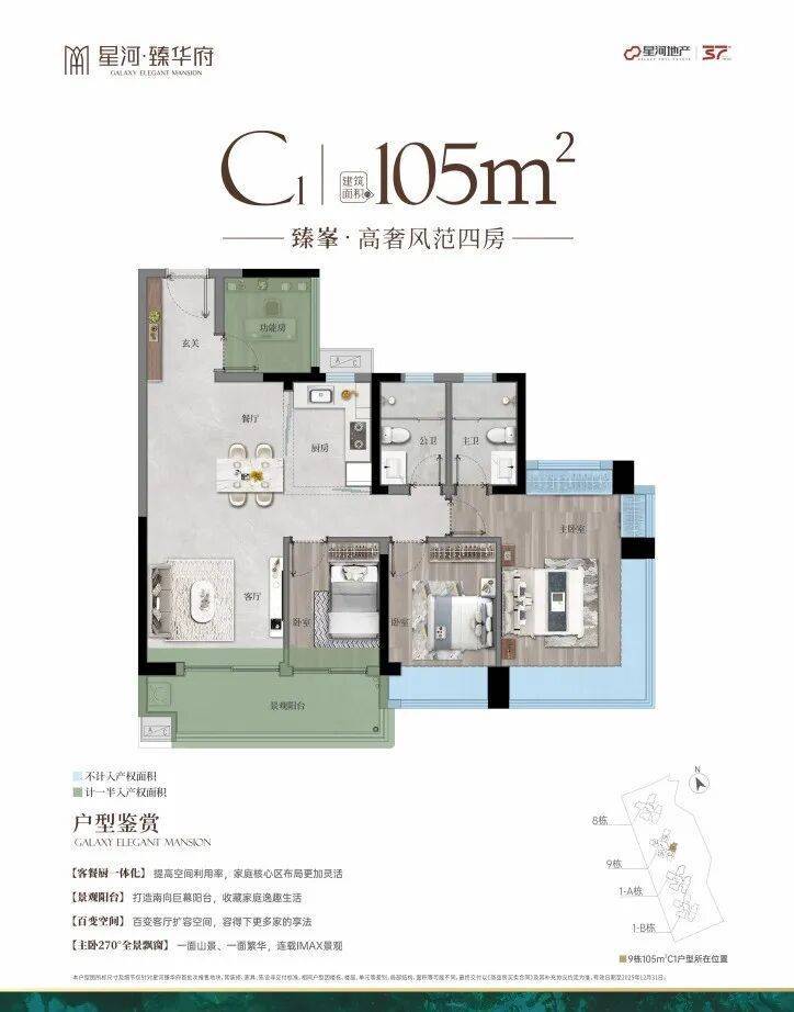 星河臻华府的产品力在同价位段中堪称“降维打击”。四大主力户型——约85㎡三房、95㎡三房(含灵动空间)、105㎡全南向四房、125㎡奢阔四房,均实现约100%实用率,远超市场平均水平。设计上采用LDKG一体化方厅(客厅、餐厅、厨房、阳台贯通),提升空间互动性;主卧标配270°全景飘窗,采光与视野俱佳;部分户型还配置入户花园、宽幕景观阳台等高阶元素。尤其105㎡户型做到四开间朝南,在紧凑面积内实现极致通透,兼顾功能性与舒适度,精准切中改善家庭对“空间效率”的深层需求。
