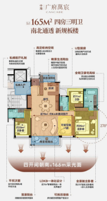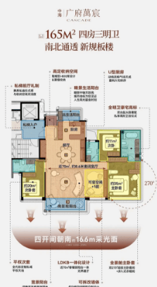 建面约165㎡主力四房户型,为家庭改善优选格局,拥有超8.5米南向阔景大面宽,采光视野全面拉满,客餐厅采用LDK一体化通透设计,原生空间尺度宽敞,整体公共区域面积可达50至60平方米,灵活可塑性极强,打通次卧隔断之后,公共活动空间可拓展至60-70平方米,能够轻松打造超大横厅、家庭会客厅、开放式休闲区等多元场景,满足大家庭团聚、居家社交、亲子活动等多元需求。户型采用南北双阳台经典设计,南向景观阳台拥抱充足阳光,北向生活阳台兼具通风、收纳与观景功能,部分楼栋北向可直面广州塔城市地标景观,坐拥独一无二的城央天际线视野,景观价值出众。