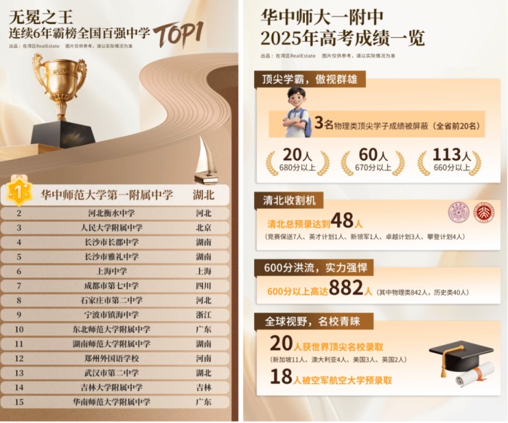 这可能是广州东部教育资源含金量最高的社区。项目内部及周边规划了15所教育配套,其中华中师范大学黄埔实验学校(12年制公办)已正式签约落址,距离项目仅约300米。该校同源被誉为“清北摇篮”的华中师大一附中,2023年高考一本上线率近100%,2024年600分以上比例攀升至96%,清北录取率超7%。这种“目送式”的名校教育,是千金难买的稀缺资源。