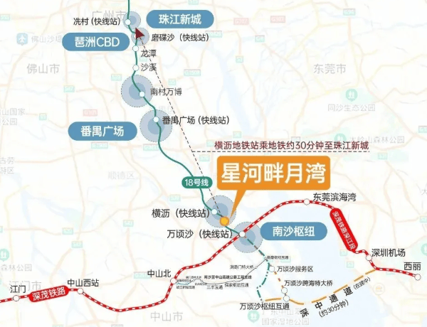 便捷的交通网络:紧邻广州地铁18号线(中国最快地铁之一,时速160公里/小时),4站可直达天河冼村,南延段规划通达中山、珠海,未来可通过南沙枢纽站实现湾区快速通勤。
