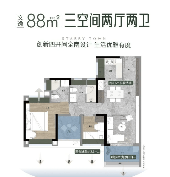 88㎡ 3空间2厅2卫:四面宽小户型,超11米景观线,精细化收纳。