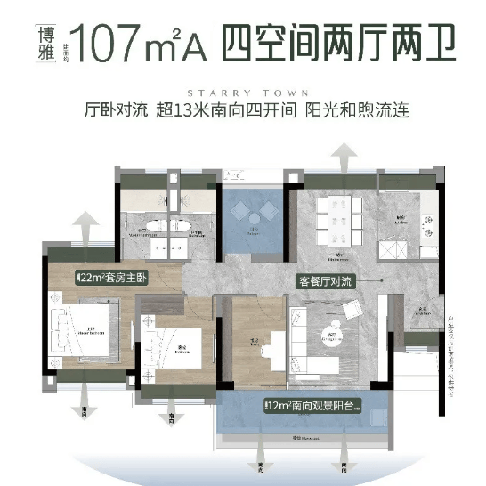 107㎡A 4空间2厅2卫:配置南向观景玄关,4.5开间朝南,客厅主卧双南北对流。