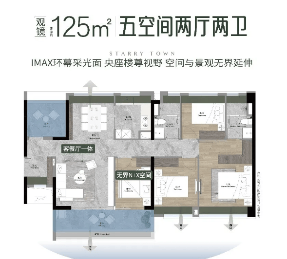 125㎡ 5空间2厅2卫:客餐厅南北对流,餐客一体化,百变大方厅。
