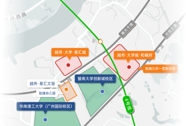 星汇城坐落于国际创新城的核心启动区,这里被誉为“南中国硅谷”,是广深科技走廊与科创中轴的交汇点。周边有华南理工大学国际校区、暨南大学番禺校区、广州医科大学二期等高等学府,营造了浓厚的学习氛围。此外,通过南大干线可快速到达万博、大学城、琶洲等地,进一步提升了该地区的便利性和吸引力。