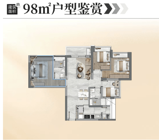 项目在售户型面积涵盖70-140㎡,主力户型为建面约76㎡三房、98㎡四房、128㎡五开间东南向望江大平层,全户型采用45度“风车”户型联排布局,做到不同户型的主要室内空间都朝南向排布,尤其卧室空间,几乎做到了100%朝南,保证室内采光充足、通风流畅,提升居住舒适度。
