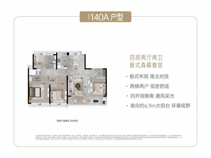 140平方米四房户型采用板式结构,南北通透,具备良好的采光与通风条件。约7米以上阳台设计提升空间延展性,同时兼顾景观与实用功能。该户型在舒适度与性价比之间取得平衡,适合改善型家庭。