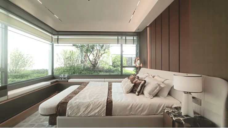 以热销的126㎡四房户型为例,得房率超82%,远高于市场平均水平。入户即设800mm深玄关收纳柜,搭配樟脑盒与透气孔,防潮防霉;三间卧室均朝南,主卧配备270°三面无柱全景飘窗,视野无遮挡;次卧可改造为“双边上下床”,轻松应对二胎或老人同住需求。