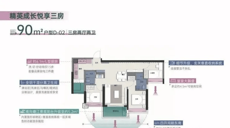 D 栋主力户型:87㎡三房两卫,实用设计,部分户型赠送面积达 7.52㎡,使用率最高 96%,客厅与阳台相连,采光通风好,总价 360 万起,适配刚需家庭;90㎡三房,布局紧凑,动静分区合理,满足三口之家需求,总价约 356 万起;107㎡三房,空间开阔,主卧带独立卫浴和衣帽间,适合改善人群,总价 500 万起。