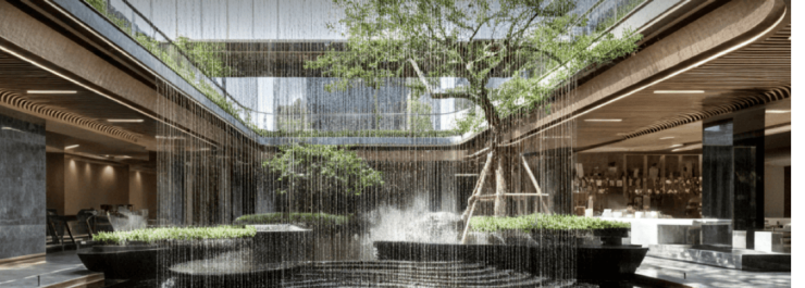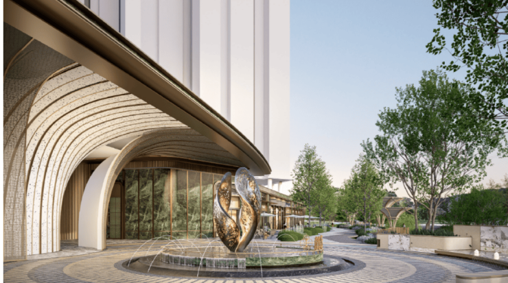 园林设计特邀山水比德国际设计集团执笔,打造了长岭居首个“下沉式庭院”景观。核心亮点在于利用约2.8万㎡的园林用地,构建了四重归家礼序,包含酒店式环岛落客区、榕树灵感雕塑、水帘瀑布景观及观景平台。这种“立体山水”的设计理念,让业主在家门口就能体验安缦酒店般的度假感。
