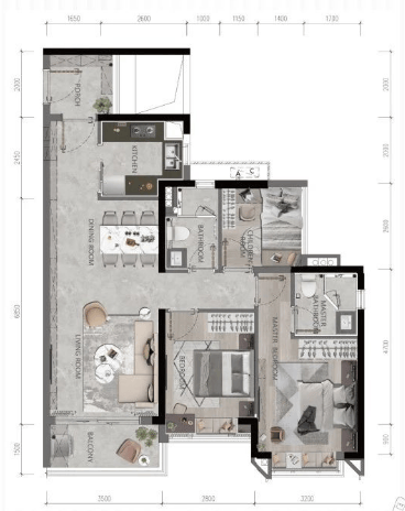 建面110㎡三房两厅两卫,豪华主卧套间,270°宽景阳台,做了3米层高,空间感十足。