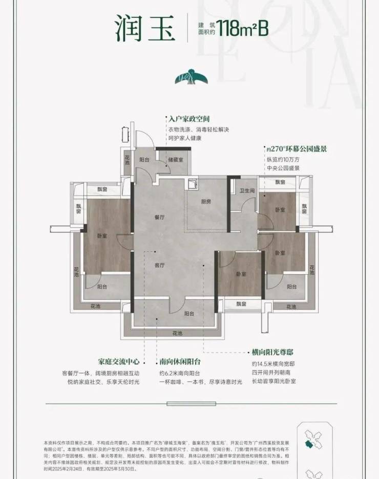 建面118平B户型:飞机户型,主卧和次卧分别位于客厅的左右两边,更照顾主人的私密性,两个客卧和主卧一样,都有270°飘窗。