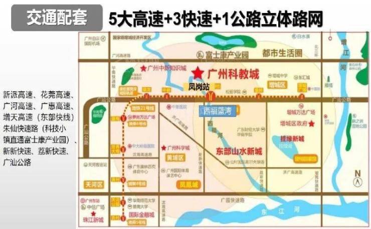 自驾方面,项目紧邻广汕公路,接驳北三环高速、广惠高速、广河高速,30 分钟达黄埔科学城,40 分钟到天河核心,满足自驾通勤需求。