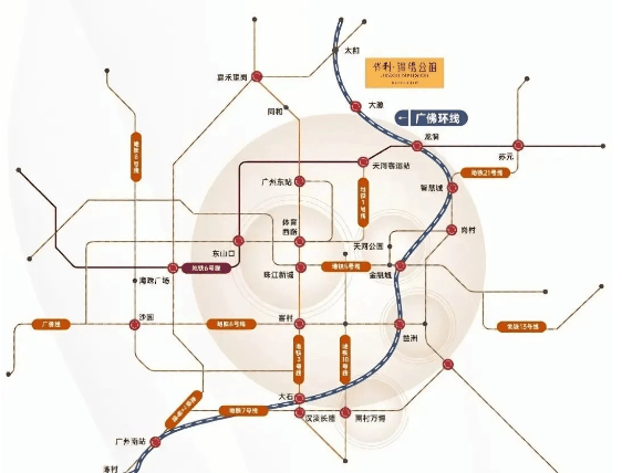 保利锦绣公馆位于白云区大源南路,地处广州中轴北延线上的广州大道北,距珠江新城 CBD 直线约 15 公里,属于珠江新城辐射圈,地理位置优越。交通配套方面,项目距离在建的广佛环城际线大源站仅 1 公里左右,通车后可 1 站到天河、3 站到琶洲,通勤效率大幅提升。