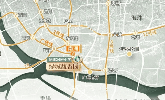 🚇交通配套:双地铁上盖,位于广佛线 / 2 号线南洲站,3 站到客村,5 站到珠江新城,7 站到琶洲,8 站畅达万博 / 金融城 / 白鹅潭商圈。更赞的是,地库直通地铁,出入归家全程风雨无阻,这可是海珠首创。项目门口道路与海珠湾隧道对接后,15 分钟就能畅达广州南。