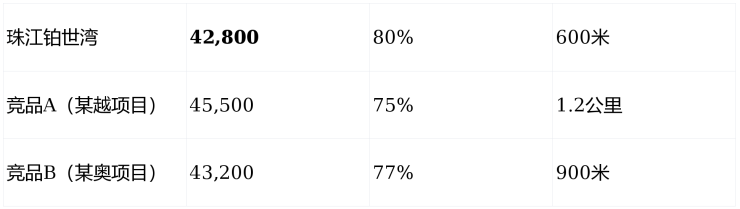 结论:珠江铂世湾在价格、得房率、地铁便利性三项指标全面领先。