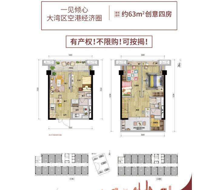 户型设计亮点满满。建面约 63㎡的复式户型,5 米层高,买一层送一层,超 140% 使用率,能做四房的设计,功能区齐全,空间宽敞。一楼不仅保证了客厅、餐厅、厨房等功能区,还有一个房间和 5.6 米长的阳台,单位入户门是 1.4 米宽的子母双开门,公共区域过道宽 3 米,居住舒适度大大提升。整体户型设计合理,空间利用充分,满足了不同人群的居住和使用需求。