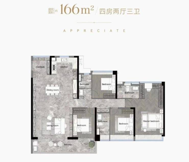 像建面约 166㎡的户型,四空间做到了双主套,特别适合三代同堂的家庭改善居住。双主套设计,让长辈和子女都能拥有独立的私人空间,互不干扰,既保证了隐私,又促进了家庭和谐。宽敞的客厅和餐厅,为家庭聚会提供了充足的空间。阳台的设计,更是将户外景色引入室内,让居住者时刻感受到大自然的馈赠。