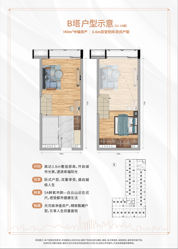广垦·天河1号提供了多样化的户型选择,包括观成大楼的31-57㎡复式空间和观云大厦的36-54㎡酒店行政公馆。每种户型均采用挑高设计,不仅提高了空间利用率,更满足了多功能需求,无论是自住还是投资都是不错的选择。