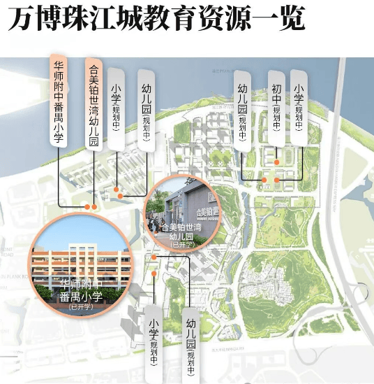 项目内规划有9所中小幼学校,其中包括华师附中番禺小学及公立合美铂世湾幼儿园(已开学),为孩子们提供了丰富的教育资源。未来还将配建初中,进一步完善教育体系。
