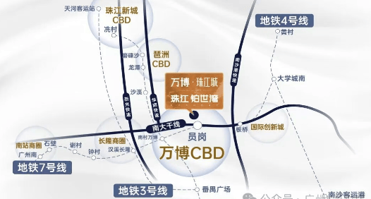 珠江万博城地理位置优越,靠近地铁7号线员岗站,交通便捷,能够快速到达琶洲、珠江新城等重要商务区。周边还有南沙港快速、新光快速等多条快速路网环绕,自驾出行同样轻松自如。