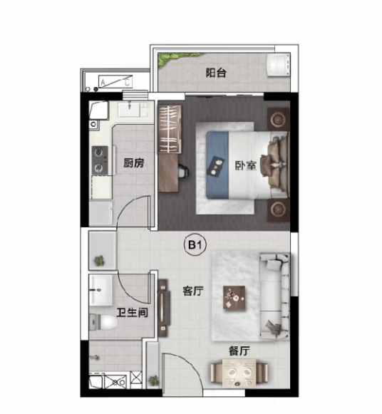 轻奢平层系列强调功能与美学的平衡。以44㎡一室一厅为例,全明格局确保全天候采光,奢阔飘窗引入自然光影,独立玄关保障私密动线;而59㎡户型更创新采用“卧连阳台”设计,将室外景观引入休憩空间,同时实现厨房、卧室、卫浴三大功能区完全分离,兼顾实用与品质感。