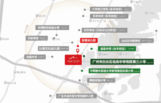 项目自身配建一所9班幼儿园,同时,距离项目750米的广州市白云区培英中学附属第三小学已经揭牌。该学校前身为凤凰小学,如今引进了“培英教育集团”合作办学,教学质量有望全面提升。周边3KM内还有华师附小、培英中学、省实中学等多所优质学府。