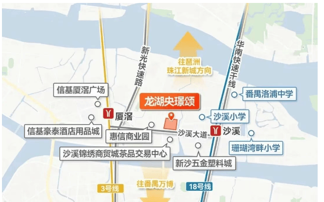 交通是决定居住价值的关键变量。项目被地铁3号线与18号线双重环绕,距离18号线沙溪站仅600-700米,乘坐该线1站达万博、2站抵琶洲、3站直达珠江新城,高效串联广州三大就业高地。前往3号线厦滘站约1公里,短途接驳便捷。自驾方面,项目紧邻新光快速、华南快速、番禺大道等主干道,15分钟内可达珠江新城、琶洲、海珠中心;10分钟直达万博CBD。环城高速与南大干线构成横向动脉,形成立体化出行网络。对于在天河、海珠工作的都市人群而言,这里实现了“离尘不离城”的理想平衡。