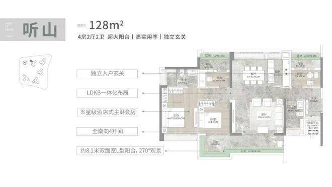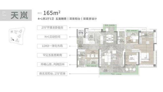 户型设计亮点满满,得房率高达 90 - 100% ,层高 3.1 米,次卧全景落地窗。建面 108 平 3+1 房,四开间朝南,近 6 米南向阳台,270 度景观,LDKB 一体化设计。建面 128 平四房,L 型独立玄关,8 米 L 型阳台,南北对流。建面 140 平 4+1 房,南向采光面达 15.7 米,南北双阳台。建面 165 平 4+1 房大平层,双阳台南北对流,朝南面宽 17.4 米,双主套设计。全屋统一高定奢装标准,结合南方气候特点,全系标配装配式全维多层防潮护墙板、国际一线品牌中央空调和新风系统,提升居住品质。
