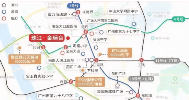 交通是衡量一个住宅项目价值的重要维度,而珠江·金瑶台在这方面优势显著。项目距离地铁8号线宝岗大道站仅约420米,步行5分钟即可抵达;同时距离2号线昌岗站约830米,双地铁环绕,出行选择灵活多元。从这里出发,乘坐地铁7站即可直达珠江新城CBD,8站可达琶洲会展核心区,无论是通勤还是商务往来都极为高效。自驾出行同样便利,沿工业大道可快速接入内环路或广州大道,轻松畅达天河、越秀等城市中心区域。