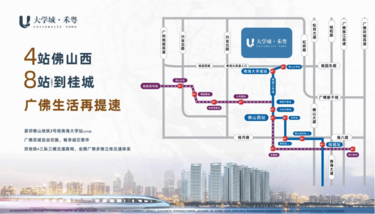 轨道交通接驳便捷,距离已通车的佛山地铁3号线南海大学城站直线约3公里,骑行10分钟即可抵达,可快速换乘地铁其他线路,通达佛山全城;距离在建佛山地铁4号线科技西路站直线约2.8公里,未来轨道交通完善后,将进一步提升通勤效率,实现“地铁+公交+自驾”的多维通勤闭环,为业主出行提供更多选择。