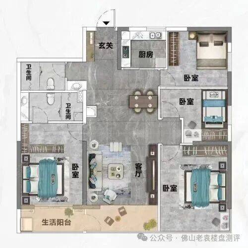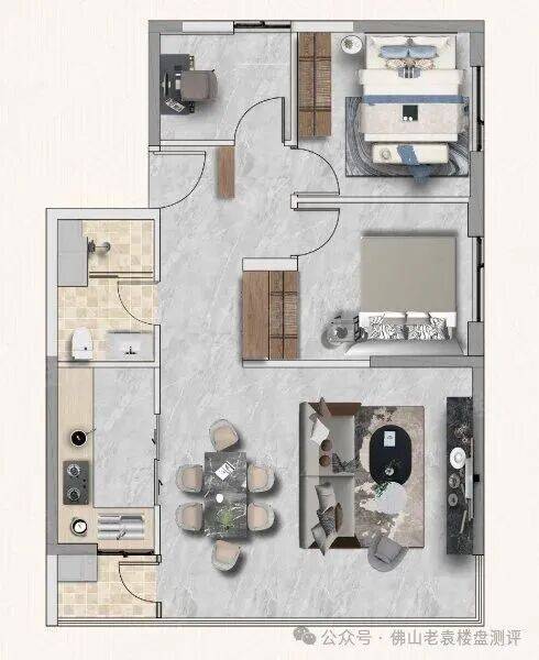 该户型是项目的核心走量户型,专为三口之家、刚需首置家庭打造,兼顾实用性与舒适性,是广佛刚需客群的首选户型。户型整体方正实用,得房率高,空间布局合理,三开间朝南,保证室内充足的采光与通风,让每个房间都能享受到阳光的滋养,营造温暖舒适的居住氛围。
