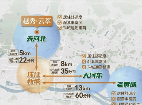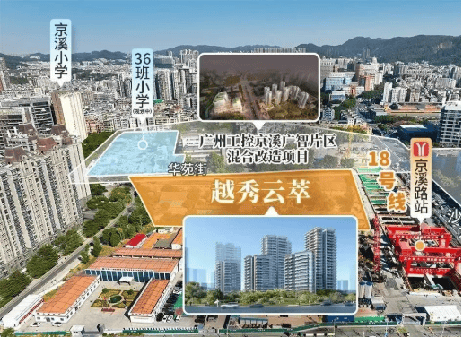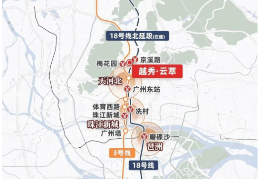 越秀·云萃坐落于白云区沙太路以西、怡新路南侧,行政归属白云,但与天河仅一路之隔,直线距离珠江新城约5公里,是名副其实的“白云价格、天河配套”典范。这一区位优势极为突出:向南可快速接入天河CBD高端商业与就业中心,向北则享受白云相对友好的房价门槛与成熟居住氛围。项目紧邻18号线京溪路站(在建),未来下楼即乘地铁,2站直达冼村(珠江新城东翼)、3站至琶洲,无需换乘;步行约900米可达3号线梅花园站,一线贯通体育西路、珠江新城。这种“双地铁+中轴核心”的组合,在白云乃至整个广州北部都属稀缺资源。
