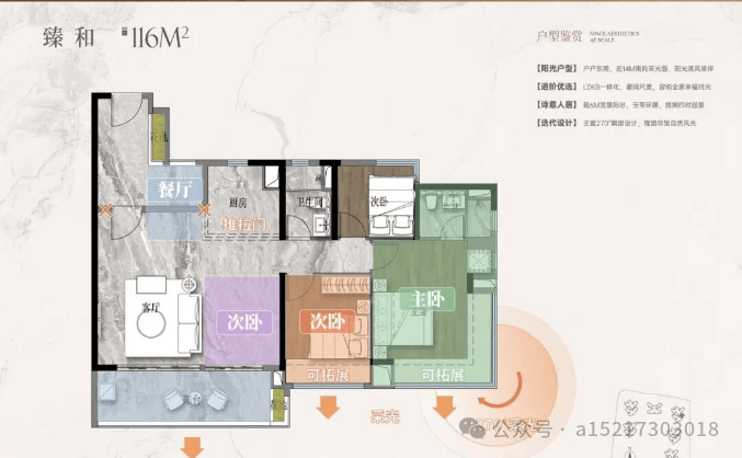 然后是 116㎡的四房两卫,这个户型是改善家庭的不错选择,很多二胎家庭,或者和老人一起住的朋友,都很喜欢这个户型。