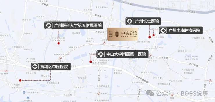 然后是医疗配套,项目周边的医疗资源也很丰富,能给家人的健康提供保障。距离项目 1.2 公里左右,就是中山大学附属第一医院东院,这是三甲综合性医院,科室很齐全,内科、外科、妇产科、儿科、眼科,什么科室都有,还有很多知名的专家,平时日常的头疼脑热,或者定期的体检,或者生孩子,都能去这里,很方便,不用跑很远的大医院。