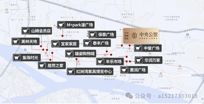 除此之外,周边还有美林天地、黄埔潮楼名店城、瑞和城、鱼珠时光等多个商业体,稍远一点还有山姆会员店、宜家家居,能满足大家的高品质消费需求,比如周末的时候,去山姆采购点进口商品,去宜家买点家居用品,都很方便,不用跑很远的路。还有潮楼名店城,是年轻人很喜欢的地方,里面有很多潮流的店铺,还有各种网红餐饮,平时和朋友逛街,都能去那里,真的很方便。