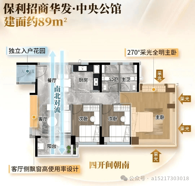 这个户型做了四开间朝南,约 12 米的南向面宽,什么意思呢?就是客厅、两个次卧、主卧,都是朝南的,整个屋子的采光非常好,早上太阳升起来,阳光就能照进屋里,一直到下午,屋里都是亮堂堂的,冬天的时候,阳光晒在身上,暖暖的,不用开暖气,很舒服。