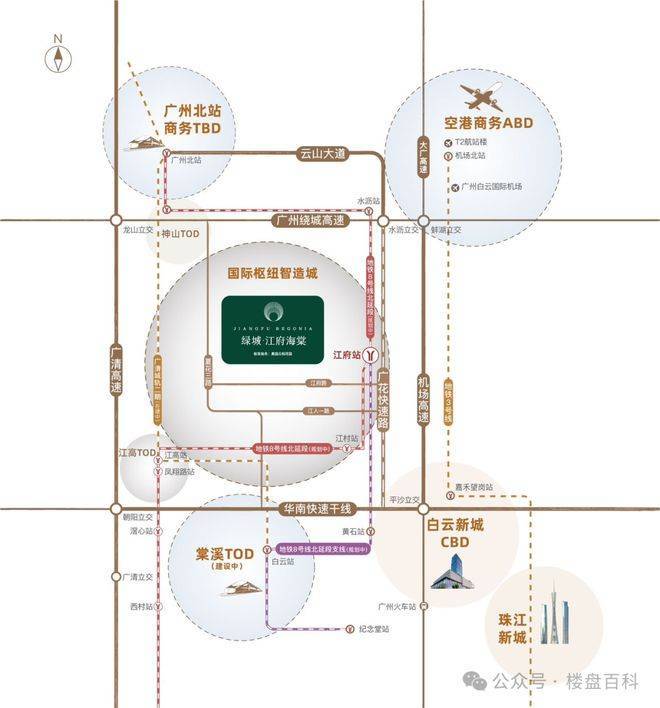绿城·江府海棠所在的江高新城,是广州“北拓”战略中极具成长张力的板块之一。城市发展往往遵循中轴延展与枢纽驱动的规律,而江高正处于空港经济区与白云新城之间的重要连接带。北接广州空港经济核心区,承接国际航运与高端产业外溢资源;南连白云站TOD枢纽,形成城际交通与城市轨道的高效联动;西侧毗邻广州国际港口资源;整体处于多重交通与产业结构交汇之地。区域逻辑清晰,发展动能持续增强。