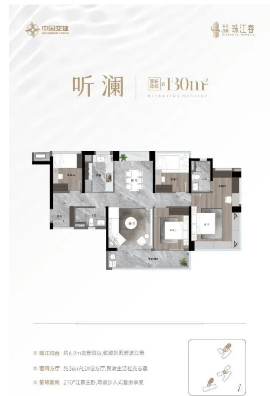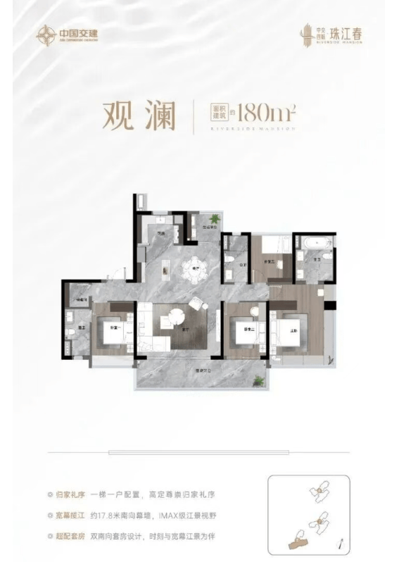 项目主力户型为130-180㎡大平层,定位纯粹改善客群。所有单位均实现全南向、一线江景,采用大面积玻璃幕墙,开窗率高达68%,望江面宽达15-18米,最大化引入自然光与江景视野。户型设计超越传统尺度:LDK一体化巨厅、全景落地窗、主卧套房配置、独立家政间等细节,全面匹配高阶家庭对功能与审美的双重需求。在新规背景下,产品通过科学动线与无柱化设计,显著提升实用率与空间感。虽单价曾处黄埔天花板,但近期价格回调后,其“一线江景+珠金琶门户+央企大盘”的综合价值,正重新定义黄埔改善型住宅的新标杆。