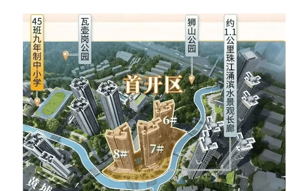 项目3公里范围内生活配套高度成熟且具国际范。商业方面,宜家家居、山姆会员店、美林M·LIVE天地、鱼珠时光等大型综合体环伺;未来还将引入华润万象系商业,进一步提升消费层级。医疗资源尤为突出:紧邻中山大学附属第一医院东院、广医五院、黄埔区中医院等多家三甲机构,健康保障无忧。生态层面,项目面朝珠江,背靠蟹山、瓦壶岗、狮山三大公园,合计超10万㎡绿意环绕,并规划1.2公里滨水景观长廊,含樱花水岸与夜光跑道,构建“滨江+公园+都市”的复合生活场域,满足全维度品质生活需求。